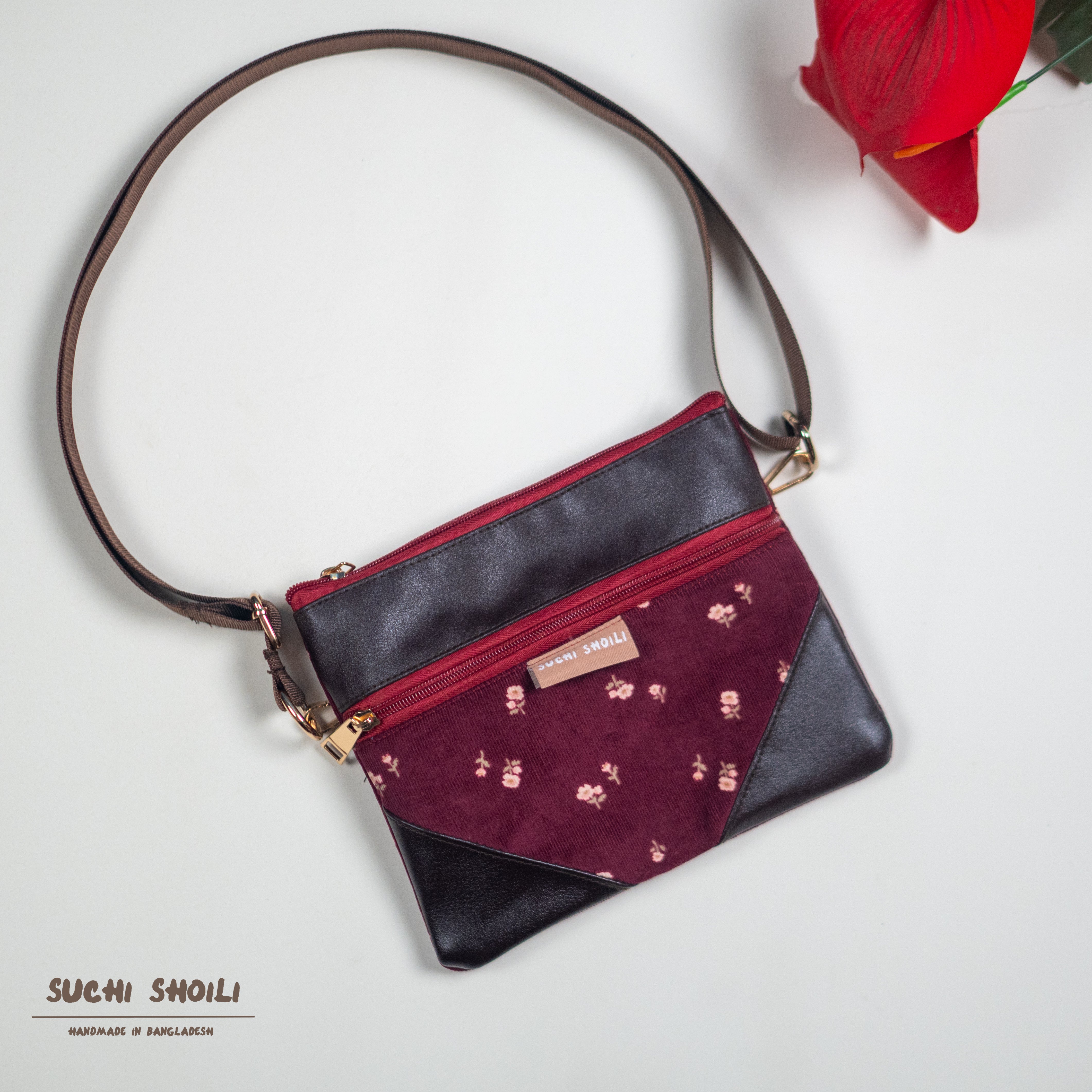 Crimson Floral Corduroy Fabric Belt Bag