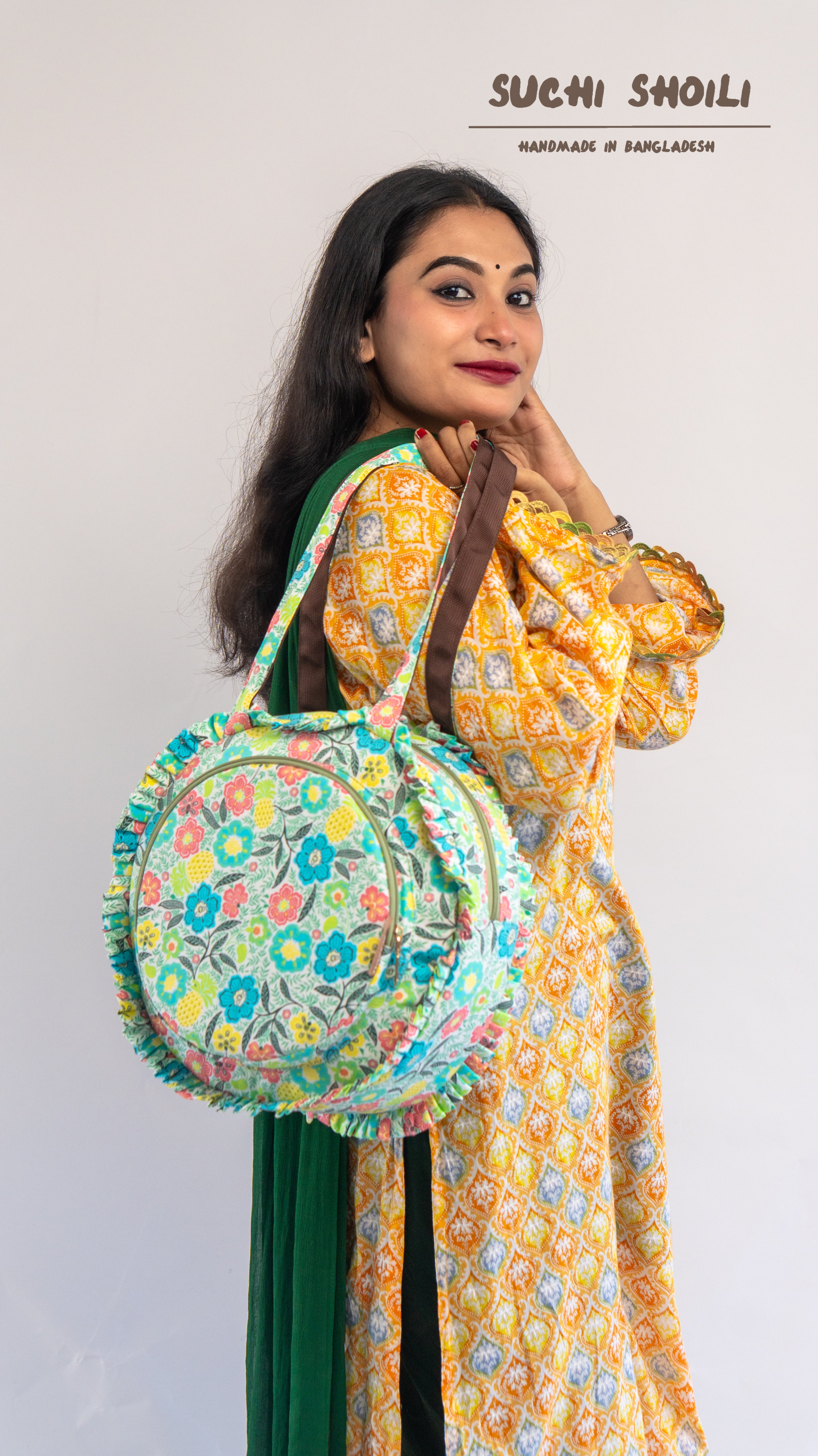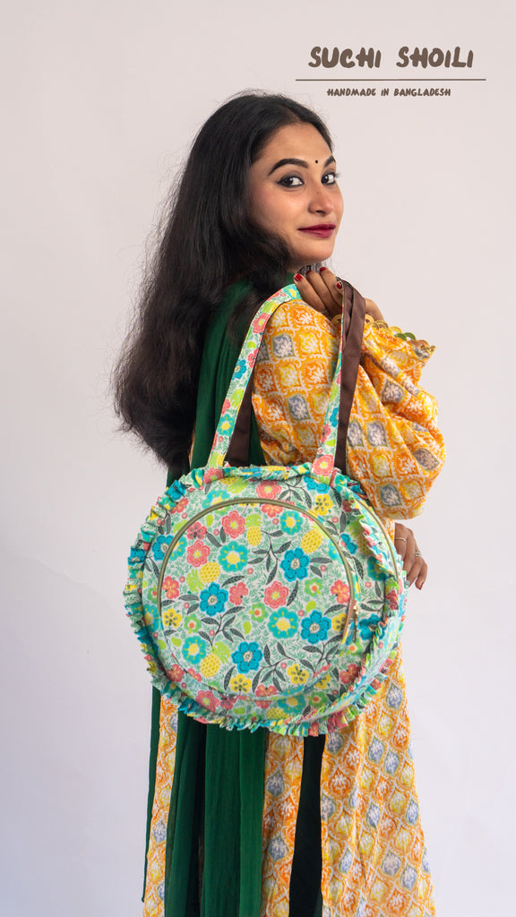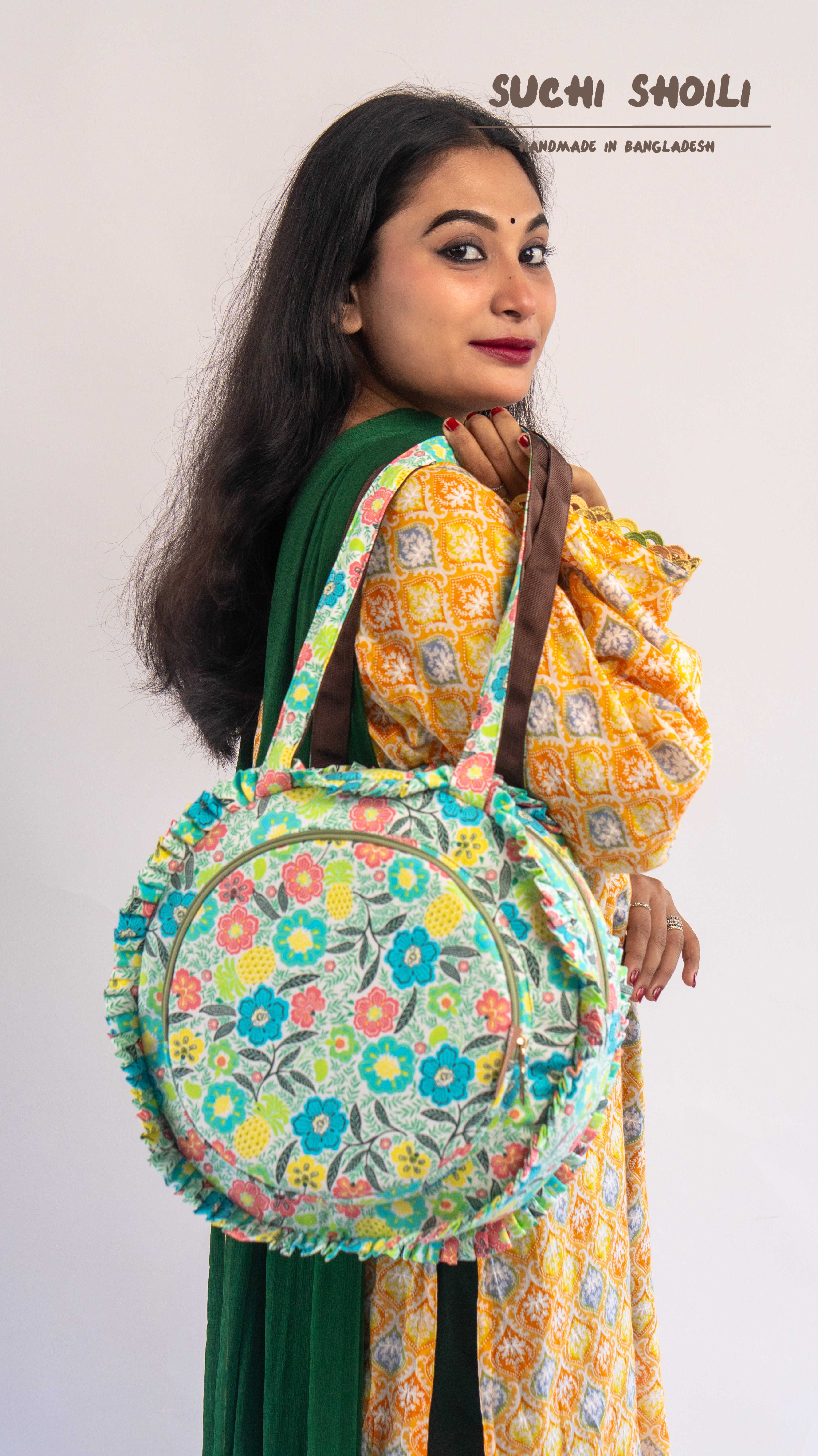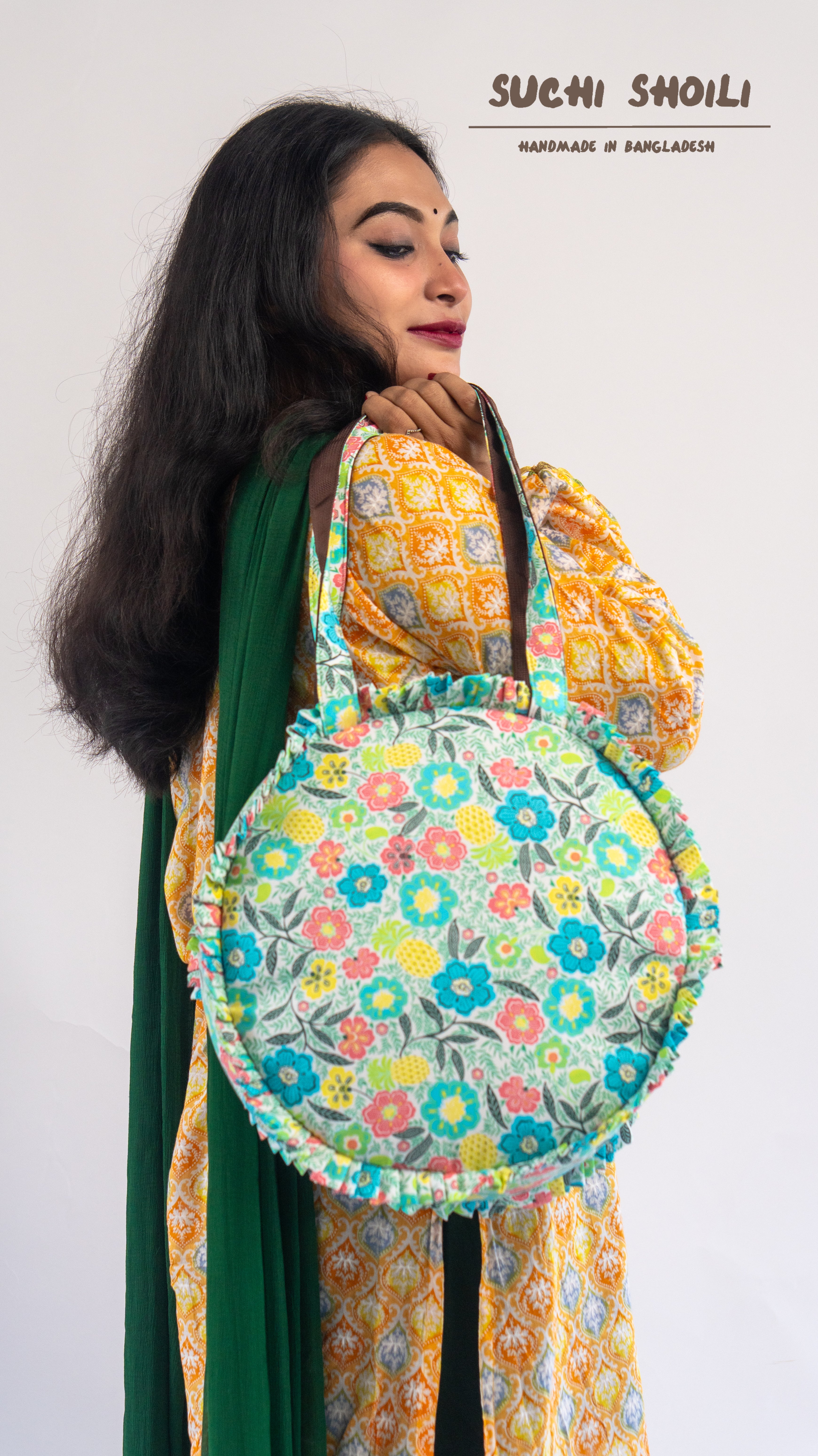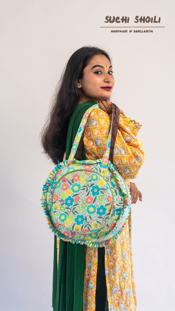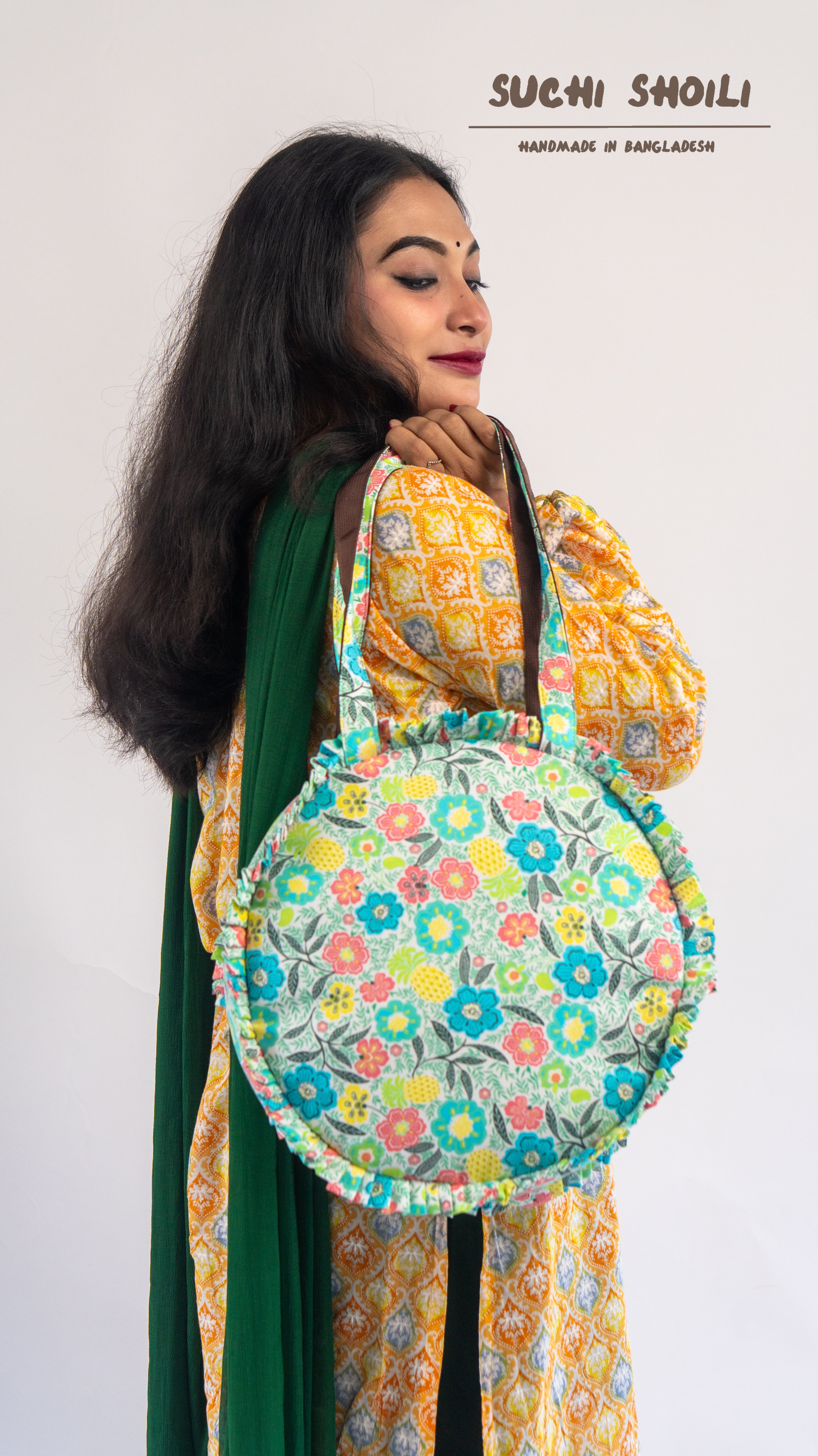 Stylish Bilkis Round Tote bag handmade in our factory with soft and lightweight materials . Two handles for wearing it on the shoulder or by hand. Top closure by zip. Large compartment with small inside pockets and an outer pocket with Chain. frills around it create it more beautiful. Same printed Coin purse as a complimentary gift with every tote bag. This bag is a great artistic accessory that suits any style. Extremely practical, comfortable and easy to clean bag that will serve you faithfully every day!
