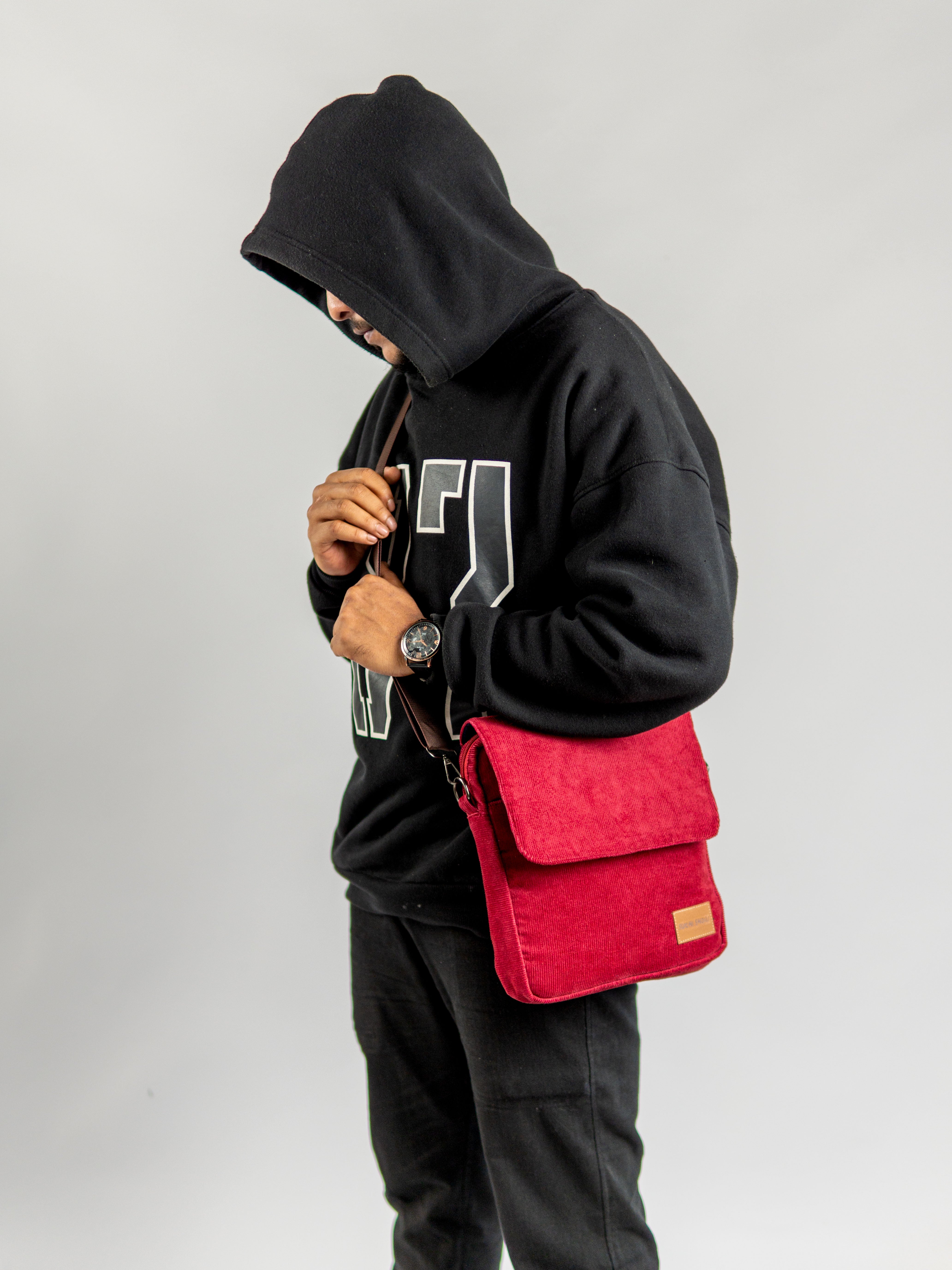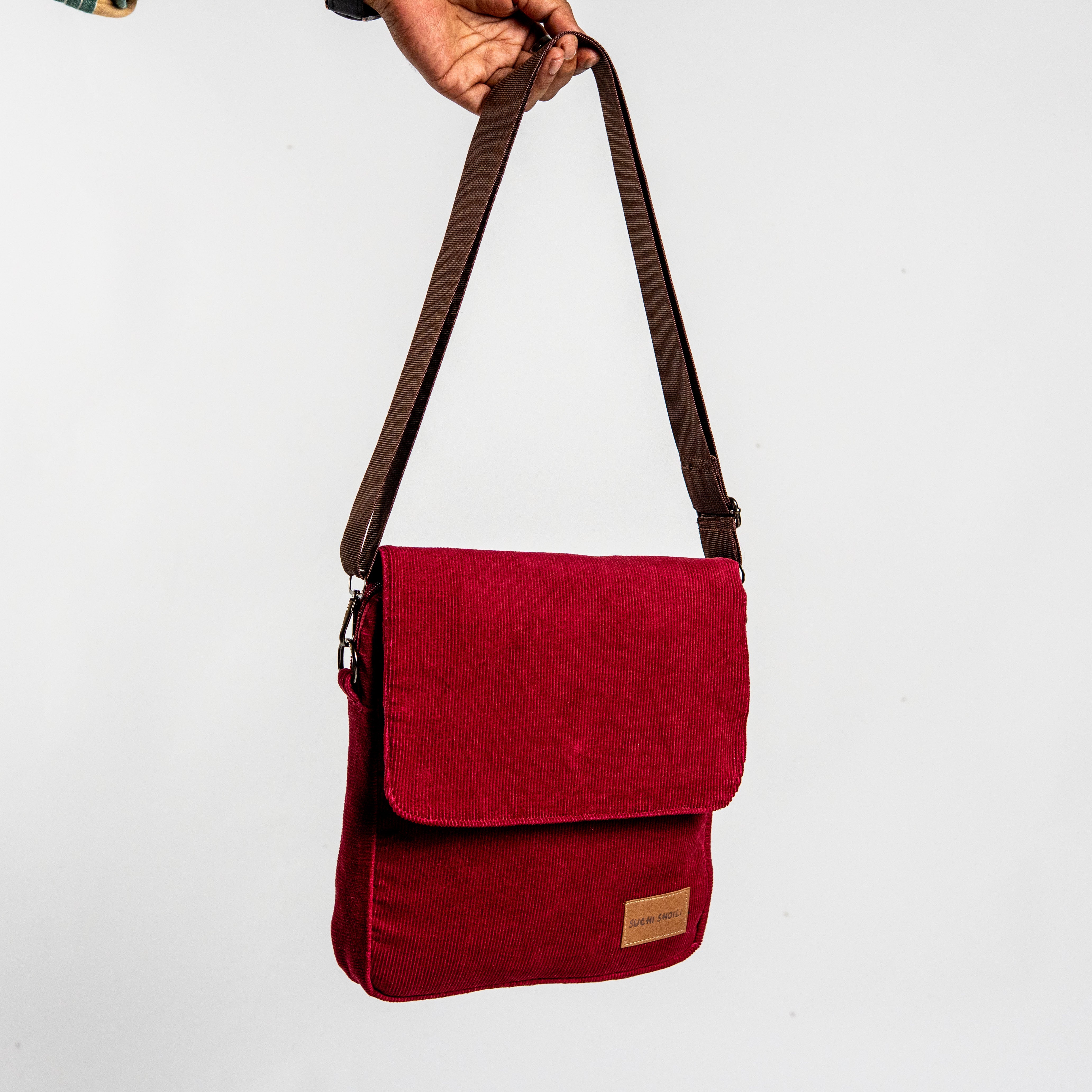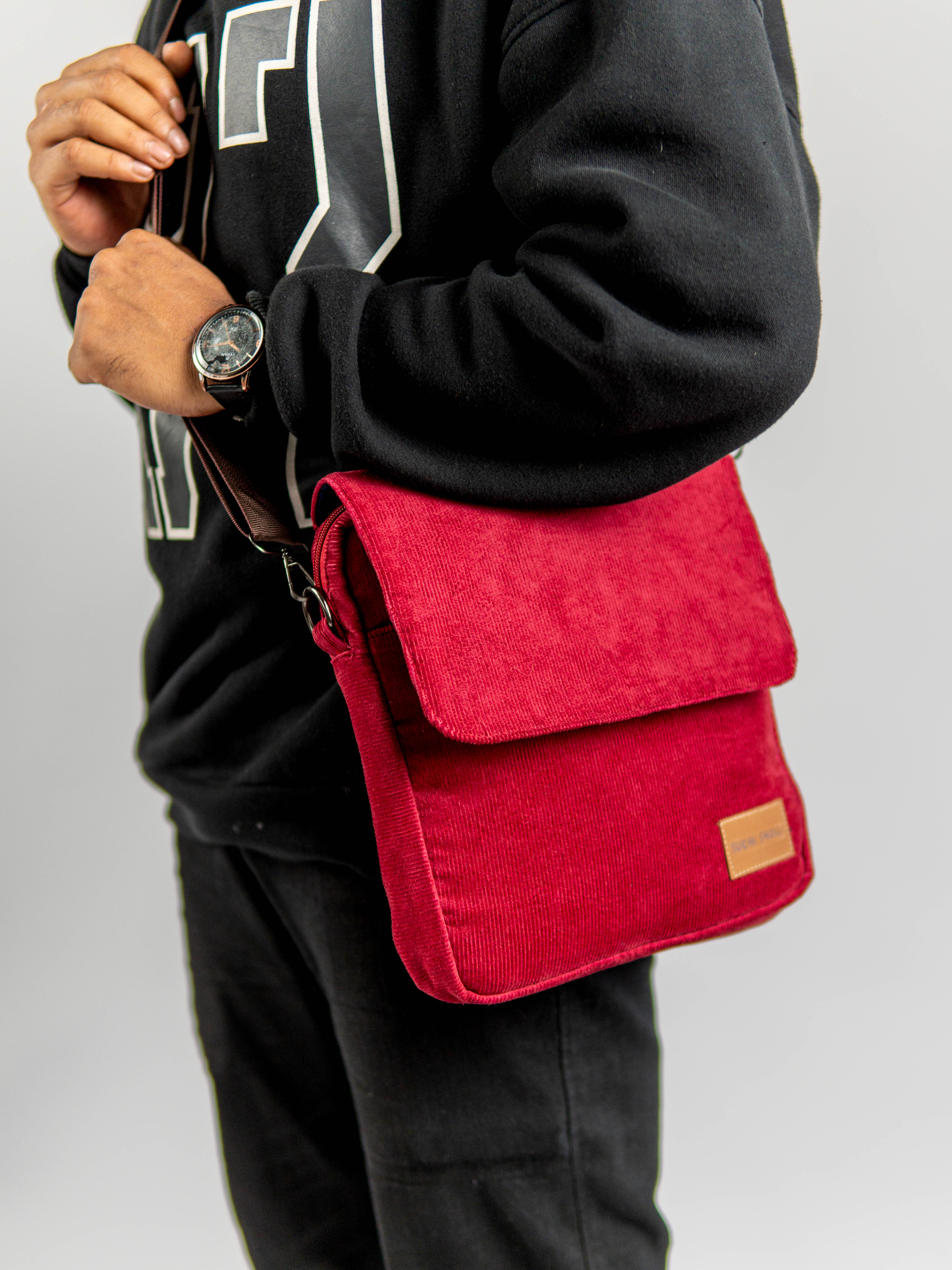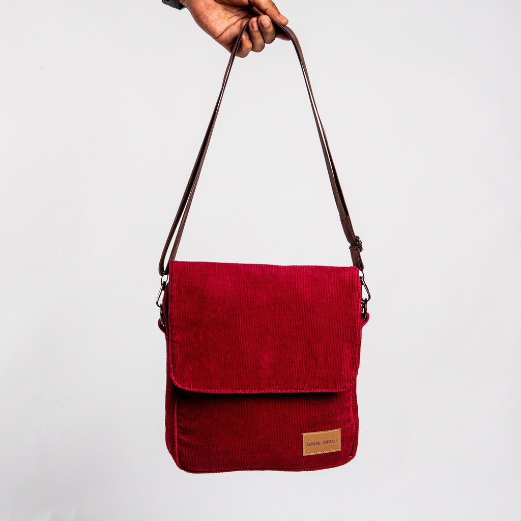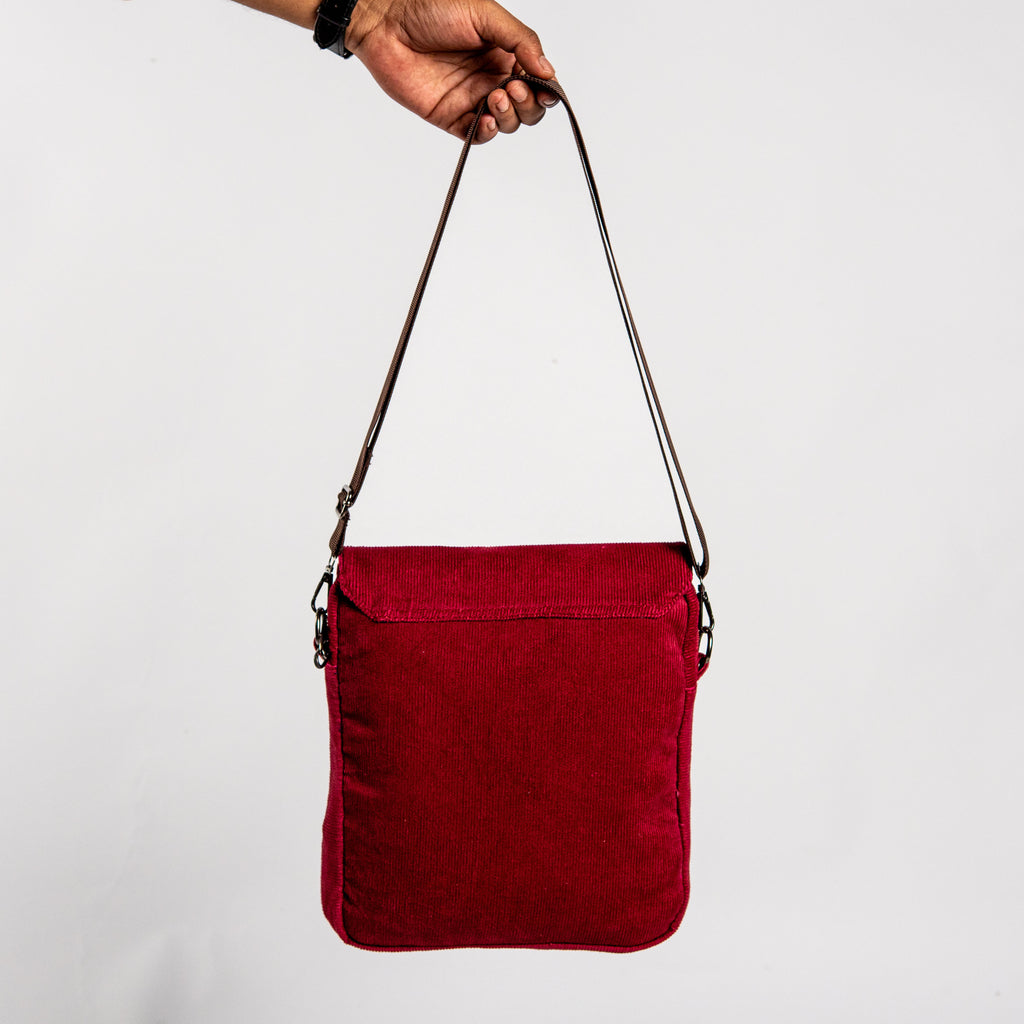 Maroon Corduroy Fabric Grid Cross Bag
