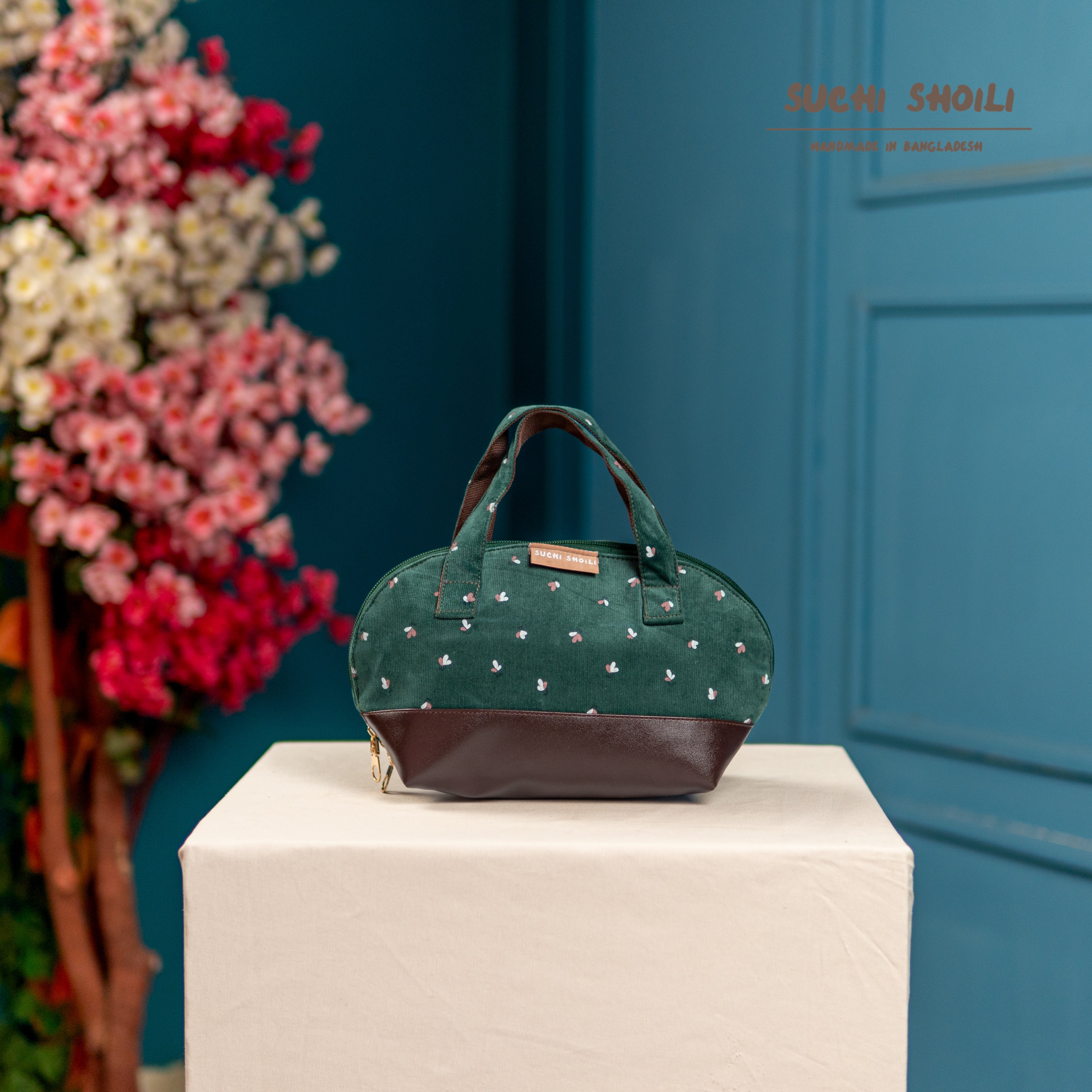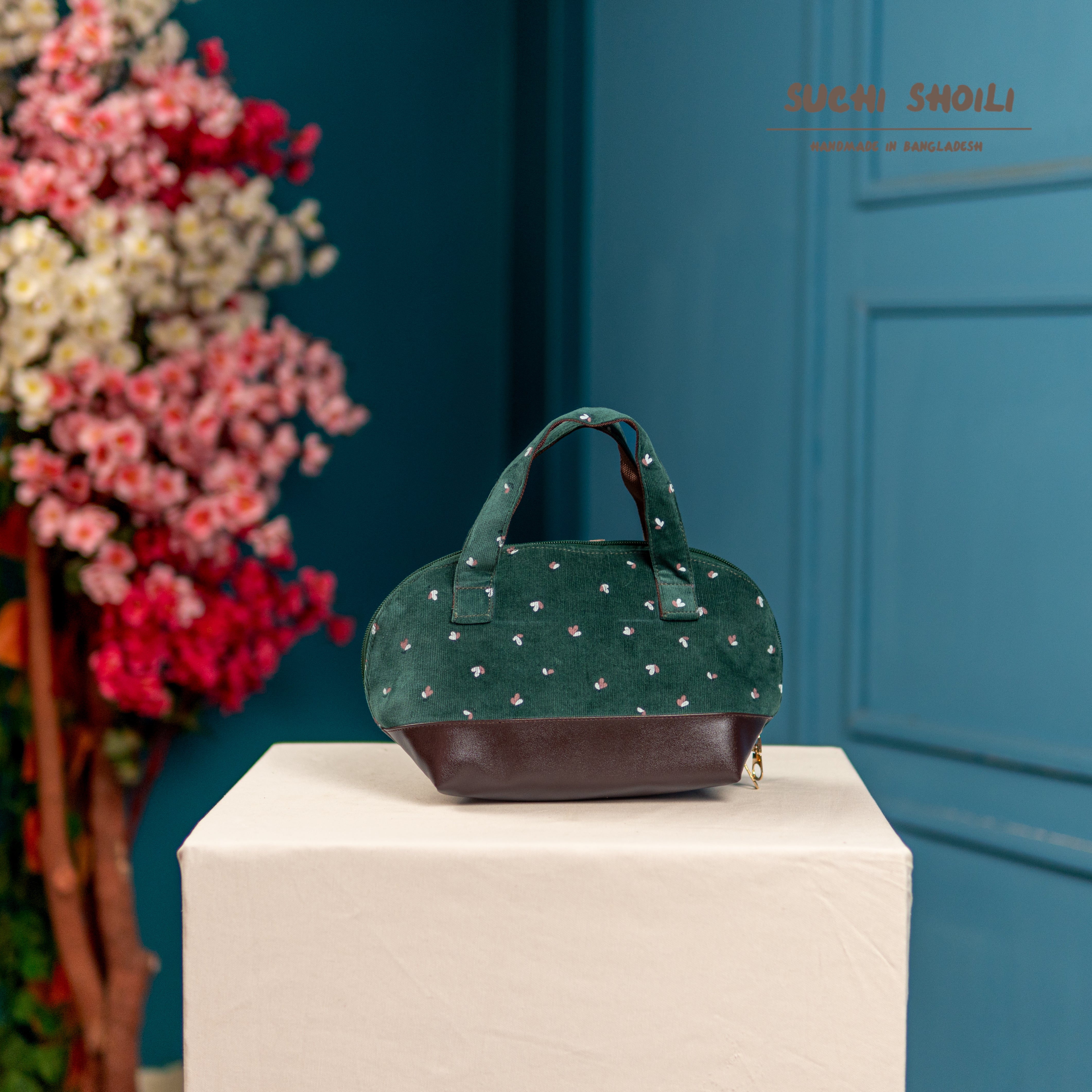 Drak Green Leaf Corduroy Fabric Round Makeup Bag