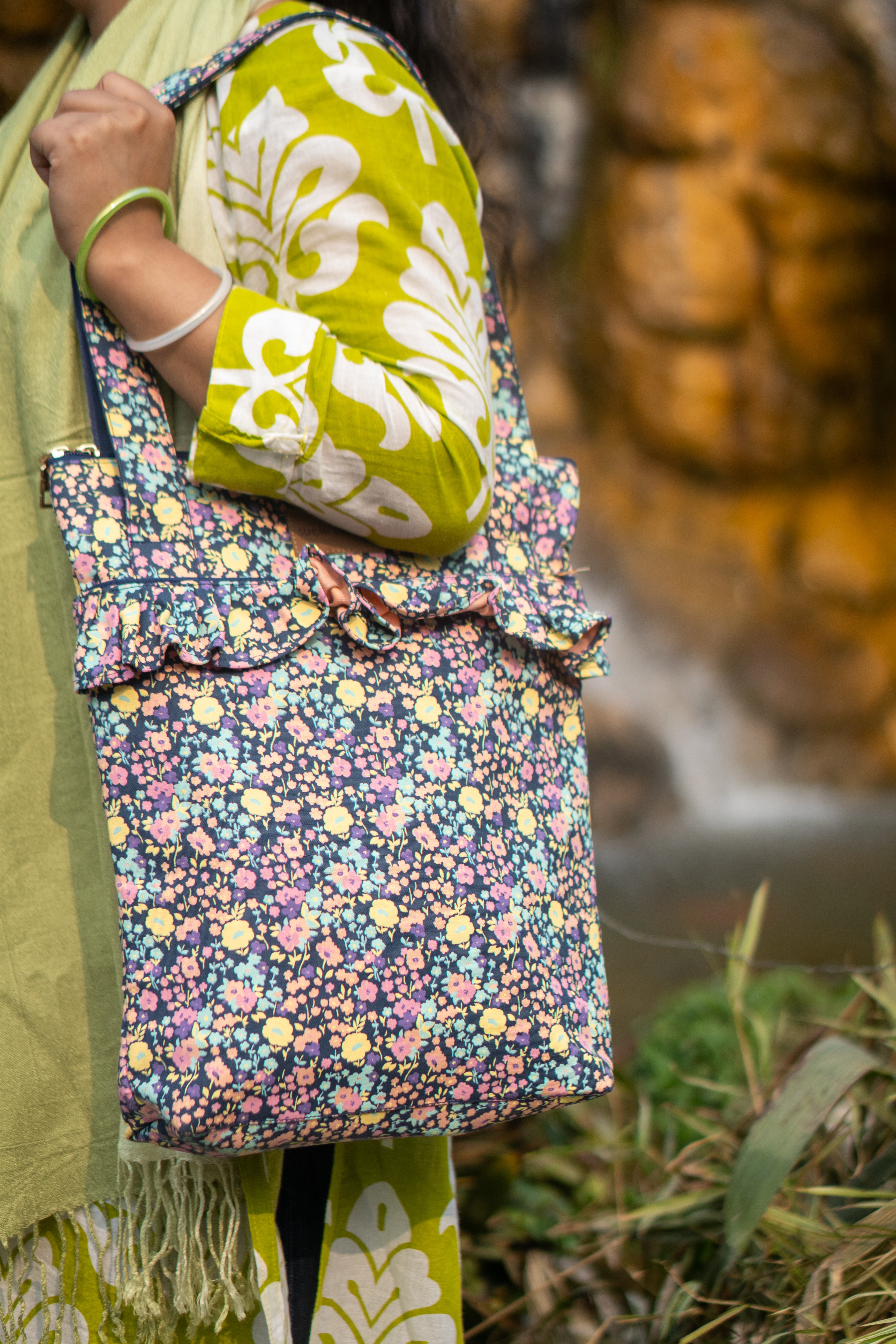 Introducing our most stylish and finished Srabonti Tote! We heard your requests, and we've added the inner chain chamber you've been looking for. Just look at how gorgeous she is! Srabonti is the perfect companion to fulfill your everyday needs, whether you're in university, office, or on the go. With a size of 15x12x3 inches, it offers ample space for all your essentials. Complete with thoughtful compartments including a back pocket, front pocket, and now the inner chain chamber, Srabonti is as functional as it is stunning. Don't miss out, get your hands on this must-have tote today!